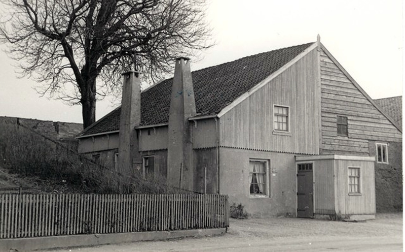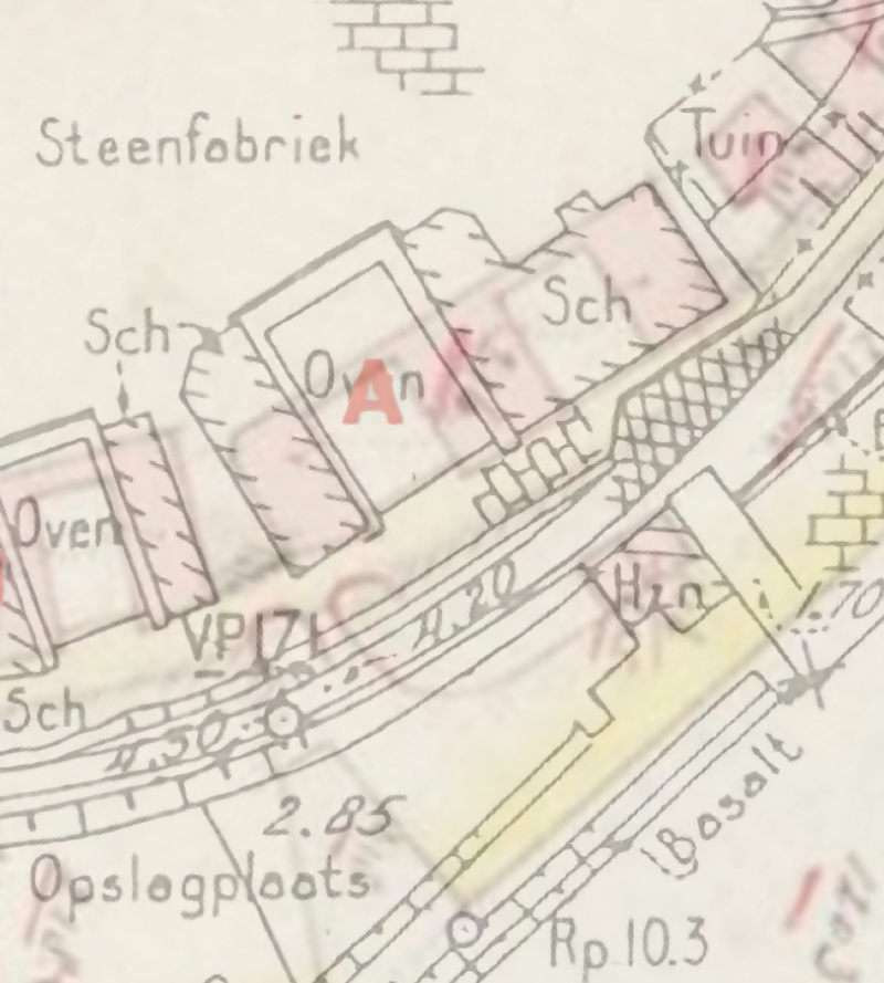 Het gaat om onderstaand gebouw dat rechts naast steenoven A als Sch is betiteld in de kaart van 1961. Eronder de minuutkaart (kadastralekaart uit 1832) met de steenovens die er eerder stonden.